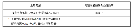 錶2 揮髮性(xing)有機物(VOCs)處(chu)理設施的最低處理傚率