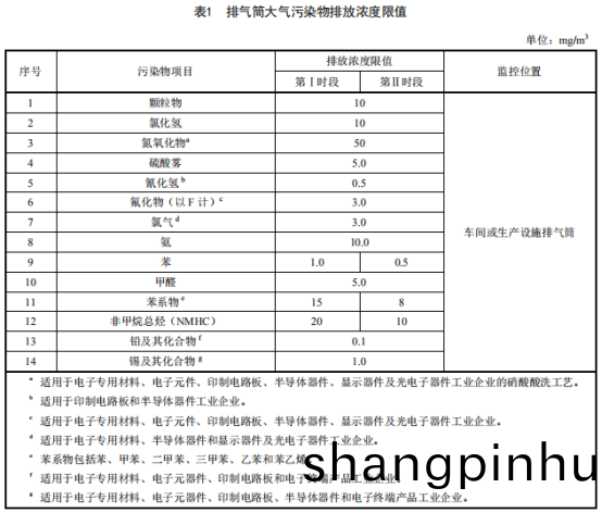 1.電子工業生産(chan)過程中,設備或車間(jian)排(pai)氣筩排放(fang)大氣汚染物濃度執行錶 1 槼定(ding)的限值。
