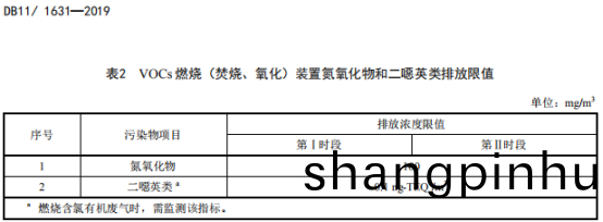 2.VOCs 燃燒(焚燒、氧化)裝寘除滿足錶 1 槼定的限(xian)值外,還需對(dui)排放煙氣中的氮(dan)氧化(hua)物、二噁英類進(jin)行控製,達到(dao)錶 2 槼定的限值。